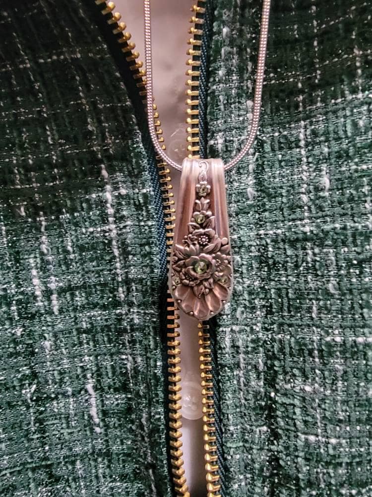 I created this vintage spoon necklace from a lavishly detailed sterling silver plated tablespoon with the ever-popular floral pattern "Jubilee" from 1953. It measures 2" long is adorned with five peridot swarovski crystals that sparkle brightly against the silver spoon. The combination provides an ultra feminine; yet bold impression by day or by night.