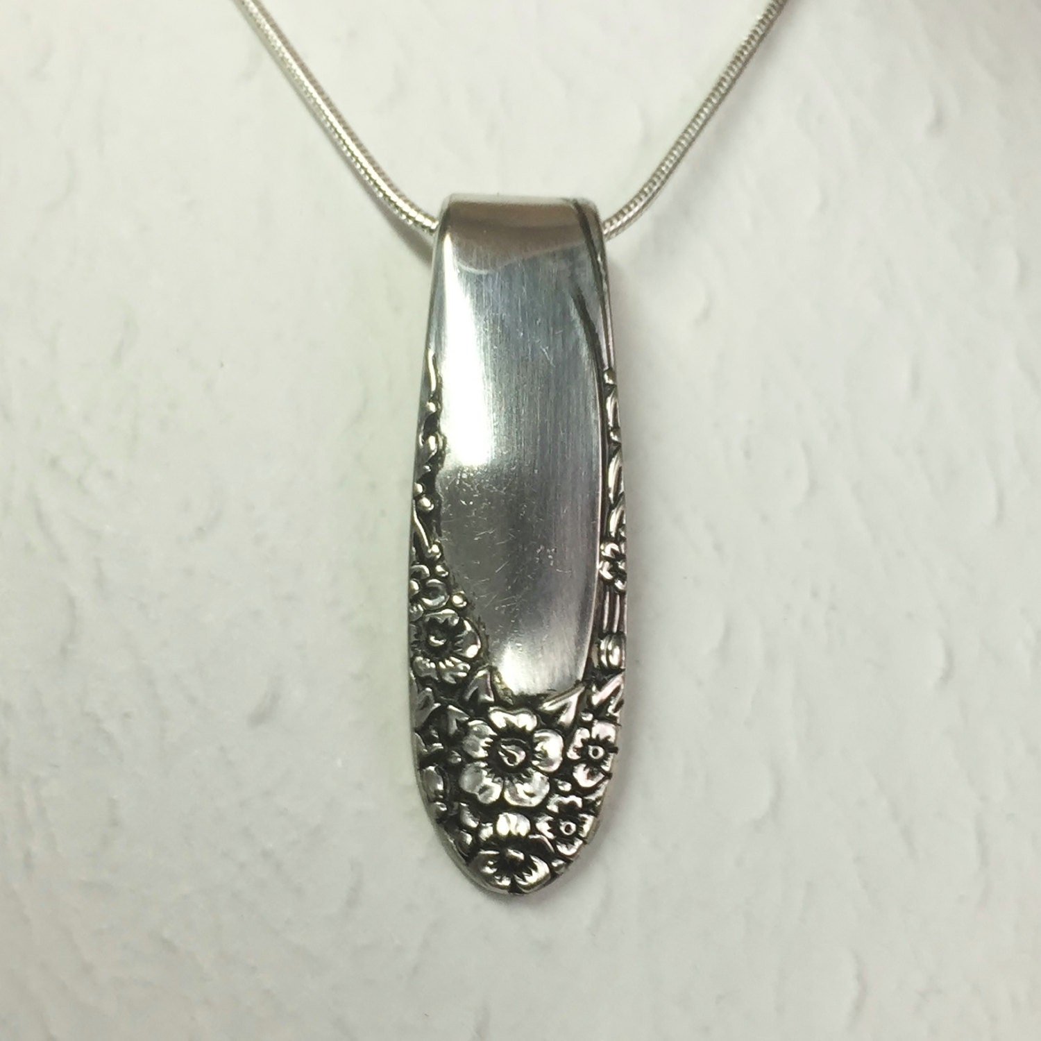 This vintage spoon necklace was crafted using a silverplated teaspoon in a delicate floral pattern called "English Garden" from 1949.