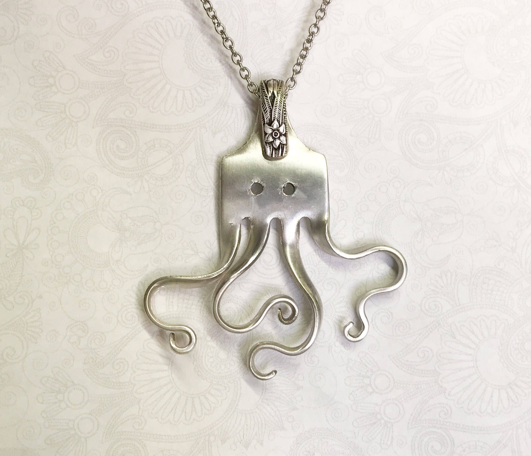 This happy octopus fork necklace was crafted from a vintage silverplate fork. It's a beautiful flowered pattern called 'Narcissus' from 1935.